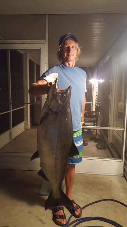 Went 2/4 last night out of Holland. Started NW of the pier in 180. Worked out to 200 and then back in to 100 over the evening. Marked 80% of the fish in the top 50 feet of water. Lost a mid teens King when I knocked it off with the net. 65 down, rigger, mag blue dolphin, 190' 8 pound king. 50 down, rigger, mag blue dolphin, 170' Lost something on 300 copper, silver/red nose j-plug, 165' 5 pound king. 30 down, rigger, mag moonshine flounder pounder, 135' Beautiful night on the water. Lake was perfect. Buddy's son who had just returned home from college came out with us and caught his first fish. Really good night.