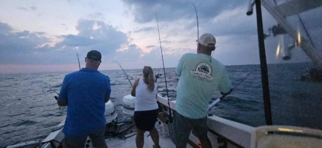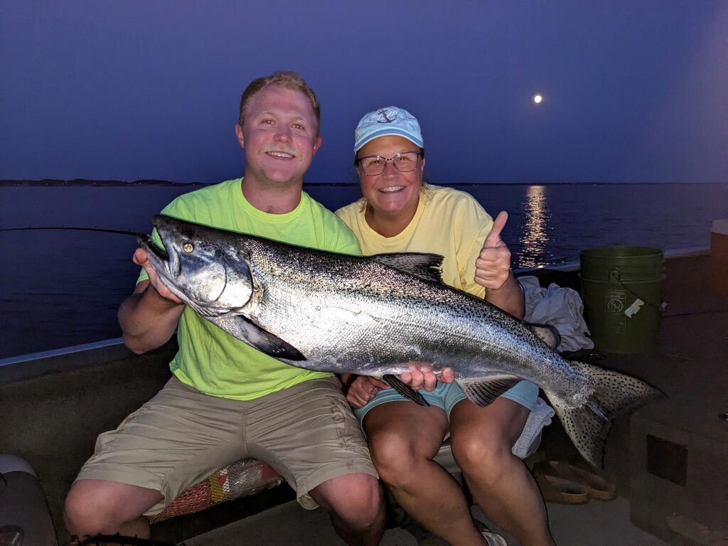 Not a big surprise that a lot of boats were out tonight. I ran solo tonight, fishing mostly 60 FOW back and forth over the Saugatuck channel. Ran one dipsey (spoon), SWR off the downrigger as my lowest presentation (meat with no teaser) and 200 Weighted Steel on the other side (J Plugs). Marked bait pinned to the bottom in the skinny water. Reports were slow from 90 to 160 FOW. I stuck to the inside cause that is what 2MD would do and kept working the marks. However, I only got one jack about 8:00 and nothing else. Put the evening program down, glow on SWR as my lowest line, a white spoon with a little glow on it on the dipsey and my money lure on the 200 Cu, a hand painted dark blue/green/gold/yellow ladder back J. I have been running this J for over 20+ years with big evening bites. Well it worked tonight. After the sun was down in 55FOW that plug got bit, both hooks were set and the result was a 17.5# king. I decided to rip the other two lines at that point. There was another boat in my proximity that was patient with my boating the fish and the 180 maneuver I made to bring up the other two lines. Looking back on it, running solo, I did not yield to his right of way after his vessel turned inland, although we were never near a potential collision. I got him on 68 to thank him for his patience as I was in his right of way and he acknowledged it was not a problem. So pleasant when captains are aware, understand what other vessels are doing on the water and not in a hurry to make way. It is a big pond out there!