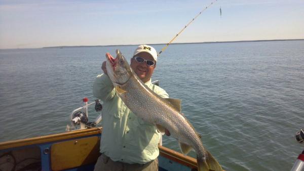 Think cold water, thats what the lakers like up here. and for the most part this time of year it's going to be pretty tight to the bottom. Before you start bouncing your cannon ball off the bottom you need to have a real good Idea just what the bottom is made of, Mud flats are good --- Rock bottoms are BAD, (Better have a few extra cannon balls on board) Our best set ups of Northern Lake Huron Lakers are as follows. Trash Can Dodgers/Flodgers in front of a two tone glow spin-n-glow like jim has pictured without the skirt and with the Mylar wings and the Glow spin-n-glow with red dots. we tie our own riggs. the spin-n-glows are tied so they run 20-24 inches behind the dodger.These rigs are tied with 25-30 pound line We also run "Peanuts" Same color as the spinnies, these are tied with 50# line and only run 12 to16 inches behind the dodger(Running the peanuts on that heavy of line that close to the dodger give them a way better action) that you don't need running the spinnies. One of the biggest problem I see with die hard salmon fisherman consistantly NOT catching Lakers is "They DON'T watch the rod tips. 99% of the lakers we catch up here in the summer will NOT pull the line out of the release !!! It will look more like a very weak perch bite on the loaded rod, and if you don't catch that, and snap the rod free and reel like a mad man to take up the slack, he might be gone, if the hook stays in it's mouth after that for the most part you get what I call a "Heavy" rod the loaded rod just doesn't look right, thats caused by the fish swimming along with the boat but not quite as fast....... Hope this helps, if you have anymore question please ask, we do catch a TON of lakers up up here in the summer, and we are getting quite good at it "Most" days .... John