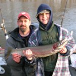Got out for some trolling last night for a few hours. Took a friend and his boy out at 6:00. Lake was flat when we got out but quickly turned once i got lines set. It went from flat to three footers in a half hour. We missed a screamer on a rigger down 48 on a lemon ice and boated 2 steelies before we headed back in. One on a 10 color, magnum purple dragon. The other on a jerry lee slider at 55. Fished 60 to 65'. By the time we got in and up to the Jail, it had calmed down. I guess we could have stuck it out. We went back out and it looked like we had a half hour before sunset. Ran back out to 60' and set up with the wind. Got my six lines set and then it was game on. First hit was a steelie on a 10/c on a blue dolphin. Got that about half way in before it came off. A 200 copper went while that was going on. A coho on a frosted veggies. Hoisted that in while my friend battled the steelie. Right about when the steelie came off, a 2/c fired. Another steelie was jumping all over. Got that right to the back before it came off. A minute later a rigger at 55 fired. Another coho on a standard size purple dragon. We had four bites in about 15 minutes. The sun was now down so i put down a moonshine spoon at 55. About 10 minutes later that one fired and it was a good one. We pulled all the port side lines while my friends boy fought his first King. It was a nice 12 or so pounde to finish up the night. We only got to fish about an hour and a half, but had great action. Five for eight, and my friends son landed his first steelie, coho and a king. Fun times!