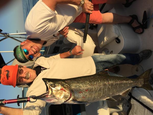 Took out a friend and his 2 boys for their first time fishing. Things picked up a bit from our trip 2 days earlier. Fished from 8 am - 2 pm and went 4/5 Fished a nice temp break straight out of harbor to about 2 miles north between 100-140 FOW 14# laker - 107 DR over 135 FOW - with white SD and lil' boy blue Howie fly 7# coho - 6# steelhead - 150' copper with orange crush 1 shaker king on 200' copper and blue dolphin mag spoon (was hoping to release him - but we dragged him around for a while and his face was really tore up) 1 - big rip on braided mag dipsey with blue dolphin fish catcher and blue chrome clean meat rig. The boys were thrilled - I love seeing newbies catch fish! Beautiful day on the water this past week!
