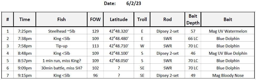 Got out first time this year fished 90-157 fow most marks in 55 no bites there. Water temp inside was 52 found warmer water out 120 caught the following there in 120-140; 7lb Steelhead on Mt Dew SD with pickled sunshine fly south troll 2.5 sog 10lb Laker on Flounder Pounder 40 down 35 back on rigger SE troll 2.5 sog Nice night on water not many boats out there. At the dock reports were very low one fish counts and one boat had just a release so I felt blessed! Tight lines and better fishing ahead!