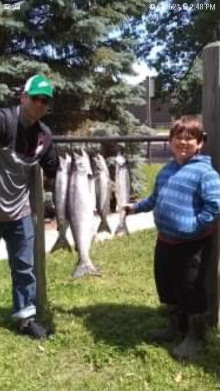 We mostly worked 118-125. 4-6. Broke off a nice fish on 200 copper HOLO frozen. Took one King on a 300 copper blue whale. Lost a big laker on a rigger white spin doctor and a homemade blue UV fly deep rigger. Other 3 fish came on blue spoons of the riggers. Set at 63 down and 2 came on the fixed slider 33 down. Took a friends 8 year old out put him on his first 2 silver fish. And tried to get him on the laker. He fought it for a while without gaining anything.