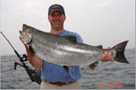 What a difference a day makes! Not that yesterday was bad by any means, but Charlie and Bill hit the Lake Ontario King Salmon JACKPOT today. We just wrenched on the fish today - it was incredible by any standards. We set up in 100 FOW and worked from there out to 160FOW as the day progressed. Our best setups were divers out 150 & 175 on a .5 setting and 250 & 275 on a 2.5 pulling a variety of Spinny and Pro-Chip/ fly combos. The Pro-Chip Coyote/Sigg's Green Hypnotist and the Green Dot Spinny/Sigg's Billy V Glow Ghost were definitely top producers today but we also took lots of shots on our old favorites Dalmatian Spinny/Sigg's Blue Dolphin, Green Double Crush Glow Spinny/Sigg's Green Hypnotist, and a Green Pro-Chip/Sigg's Green Apple. Hot spoons included the DW SuperSlim Midnight Special, and an NK THAT spoon fished off of riggers down 75-85 ft. To be honest, the action was so good today that it really didn't seem to matter what we put in the water as long as we had it at the right depth. From the time we got set up till the time we pulled lines Charlie and Bill were HOOKED UP - and I mean we were fighting fish allllllllllllllllll day long! We saw Jax, Maniac, and Landingzone out there putting the smack down on them today too. It was crazy-good! Here's a few pics: We're back out again tomorrow, weather permitting. MAN I LOVE THIS!!!!