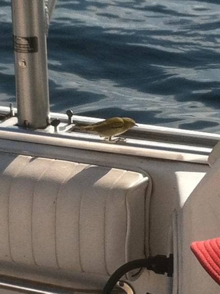 11. A little change in the fishing today compared to last few times out. It was kinda rough at first so went south looking for calmer water and set up in front of sliders in 115 fow and began east troll with the wind. Marked fish about 75' down from 85 out to 115 when I set lines but they vanished by the time I got back to 110; before first light even. Big temp break from 60 down 68 degree to 46 deg 80 down. Began trolling south between 100 and 120 and went 1 for 3. Got down close to the ball and began making east-west passes taking a hit with every pass through 120-130 fow. No big first bite flurry, just steadily picked away at 'em all morning finishing 6 for 8. Crew just had to try out to 170 fow and took our last fish there, a laker which went back in the water. Biggest was a dark 13 lber but the others were smaller and had pink meat. Flasher fly bite only this morning. Lightsaver spindoctor with Big Weenie Bushy Beaver on braid dipsey set at 3 150 back took 3 hits. UV crush spindoctor with Big Weenie Last Brunch on braid dipsey set at 3 125 back took 2 hits. Green/glow spindoctor with Big Weenie Pig in a Blanket took 3 hits on rigger down 65. One other fly bite this morning was this little guy that spent about 2.5 hours picking bugs off the boat.