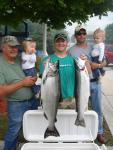 Here is my boats 2 day breakdown from fishing the derby out of sheboygan. Saturday: started at 5am north of town in 45 to 70 ft targeting the 4 yr old kings that are beginning to stack up in this area. Went 2 for 4 by 8 am. They went 19 and 22 pds, and both hit j-plugs on a 5& 7color setup. We picked up and ran to 330 ft (11 miles) and went 7 for 9 by noon. 3 bows, 1laker, 1 coho,and 2 kings (2 yr olds). Best setup out there was 200 copper with a green and silver stinger spoon. Took 3 fish. Other 4 fish were on all different rigs. After coming back to weigh in we found out that boats in 400 ft (14 miles) did even better! Sunday: You guessed it, straight to 400ft at 5 am. (long run!) Setting lines at 5:45 am. The graph was loaded! 35 to 60 down was the zone, and the fish were active. We ended at 11 am going 13 for 17. 6 cohos, 2 lakers, 3 bows, 2 kings(1 3 yr old, 1 2 yr old) Best rig was a hammered silver dodger pulling a white tinsel howie fly. Ran a set on both sides off a 5 color and combined they caught 7 of the 13. All the deep water fish were between 3 and 10 pds for both days. So the size of fish is close to shore, but the numbers of fish are out deep.