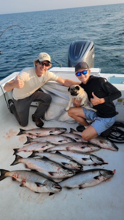 Started late at 7:00 am North 1 mile in 125 fow. Stayed on a 330 NW troll out to 185 fow then turned South zig zagging in to 172 fow back out to 185 fow Marked fish back and forth in those depths, once past 185 fow stopped marking fish and the same at 172 fow so I stayed in between.Went 3-3 running solo with first fish taken at 11:06 and I went to 1:00 and called it a day.Fished 60 ft down to 90 ft down marking fish from 70 down to bottom. Tried going deep but had no takers close to bottom. Found temp break around 58 ft down. Ran rigger,mag dipsey, and a 300 ft copper. Used all mag spoons. Tried flys deep with no takers. Ran between 1.9 and 2.1 speed at the ball. Took 2 kings on the 300 copper using a Pro King Screwdriver Mag and 1 king on the rigger 82 ft down Blue Hulk. -