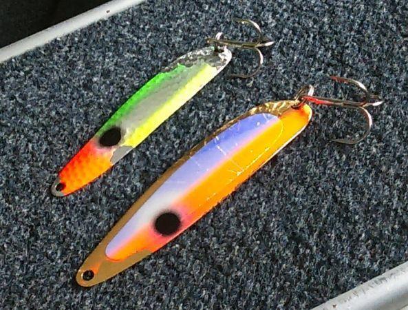 Lets see if I can remember what hit... 1. Mag Diver 117 ft back - 10" Dragon Slayer Spin Doctor & Meat Rig - king 2. 200 Copper with orange Big Weenie Brand flasher & meat rig - miss 3. 150 Copper with Standard Moonshine Agent Orange RV - king 4. Mag Diver back 95 feet - Green Jeans Flasher Fly - king 5. 200 Copper with glow 4" plug - king 6. Downrigger at 35 - Standard Flounder Pounder Moonshine spoon - miss 7. Downrigger fixed slider at 45 ft - Standard Double Trouble Moonshine spoon - king 8. 150 Copper - Standard Bloody Nose Moonshine spoon - king 9. Mag Diver 50 ft back - Mag Black ladderback Moonshine spoon - king 10. Mag Diver 50 back - Standard Blue Jeans Moonshine spoon - miss 11. Mag Diver 50 ft back - Mag Black ladderback Moonshine spoon - king -