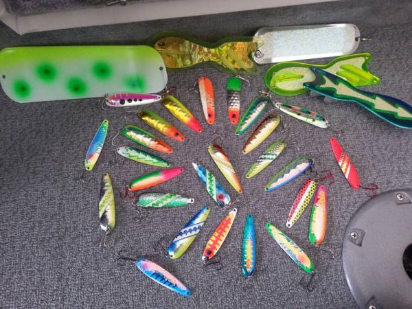 14. Hey guys selling some of my baits because money is hard to come by right now. These spoons and flashers have all caught fish. Im not selling any individual items, i am selling it as a whole for $110. I also have a plug that's not in the picture that i will throw in. Its a glow plug with a green back and black ladderback.