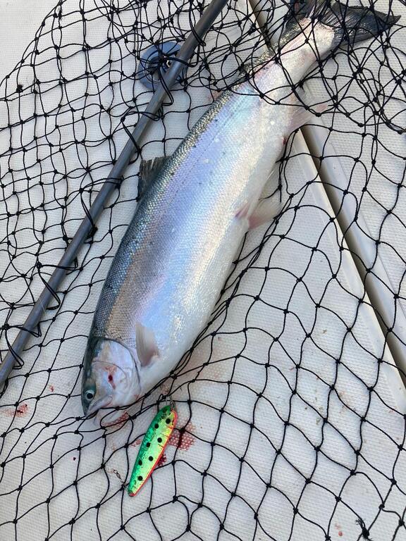 Fished 120-220 pretty much straight out. 1 for 2; nice steelie in 188’ trolling west on 290’ copper on Warrior whammy spoon. Backing line broke on nice fish on 225 copper in 210’ on MS bloody nose spoon.