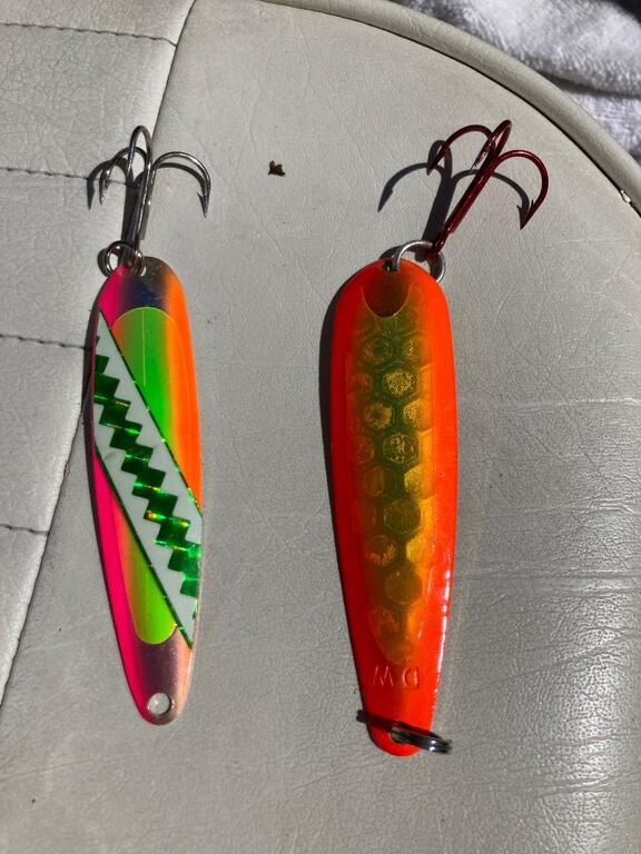 I did an unofficial non-scientific count on this forum and another forum and here are the spoons that caught the most fish: 1.(7 times) Dreamweaver blue dolphin and rv bl dolphin. 2. (5) Moonshine (MS) bloody nose. 3. (5) MS Bad Toad RV 4. (5) MS Raspberry carbon and RC rv. (Rasp C caught record 46 or 48 pd king last yr) 5. (4) MS green flounder 6. (4) MS dancing anchovy. All with 3 times on list: Flea 4 All by Fuzzy Bear Lures MS 5 eyes MS Green knight MS wonderbread MS blue jeans. Notice a pattern here? Moonshine glow spoons almost all. We always have a bloody nose and blue jeans rv down. And, some non glo that that I use a lot: Bl or gr dolphin Carmel dolphin Double or crush Bl or gr mixed veggies Jagger bomb MS flounder pounder Rasta goose (gold in spring); silver later Gr toad w/white back (spring) Jordo n gold Jordo MS happy meal Whammy (by Warrior, this is usually down mid morning) NBK , aka nat born killer Watermelon Any one called alewife: gr, pk, etc. Very few guys post reports, so results could be skewed, but gives a good idea. And, when none of the above don’t work I look in my boxes for stuff they haven’t see in a while. Lol.