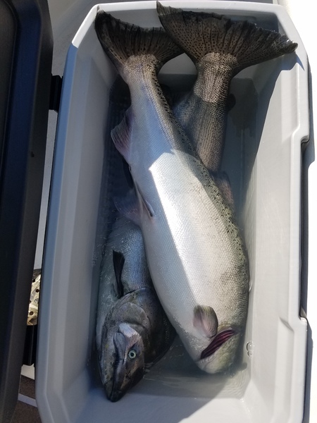 Quick trip tonight with the wife, great night for a date on the water. Ran straight west again and set lines in 140 fow around 6pm. Fished until just after 8pm and ended 2/4, lost one at the net and one in the air, the steelhead were feeling sporty tonight. South troll took two hits and north troll took back to back steelhead later in the evening. Really concentrated on 145-160 fow, marked consistent bait and fish 50-100 feet down. What work 2.4-2.6 sog 1 king rigger 81 down 160 fow south troll green, blue chrome slim spoon, Lost 1 king dipsy set on 2, 175 feet back 151 fow hammered purple and blue watermelon spoon, Netted Same downrigger went twice 147 fow north troll 60 down glow ladder back NBK dw slim spoon 1/2 steelhead Hope this helps anyone heading out in the am!