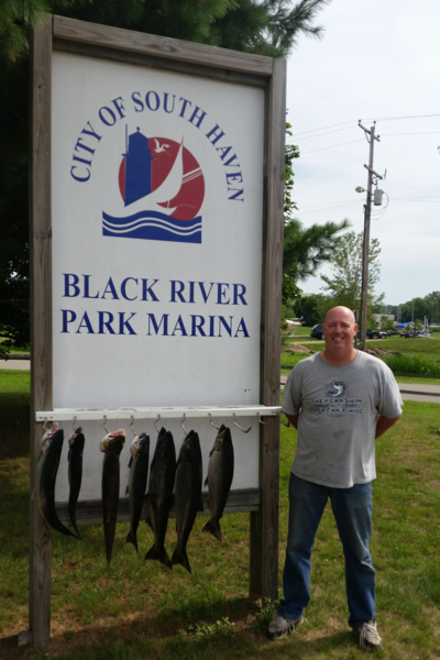 We cleared the river about 0545hrs heading S/W to 50fow so our 6 lines would be wet by the time we hit 60fow. At 60fow hit our 1st King on a pearl glow ladder back on a DR down 50’. Then at 65 hit another King on a yellow tail on the same DR. That was our last spoon/DR bite. All the rest of the fish came on #4 & #5 grn. glow splatter J-Plug off of CU., 150x30, 200x45 and 250x30. The ice blue glow ace-high plug that was hot a few days ago was as cold as ice. 6 fish in the box, 3 Kings, 1 steel, 1 ho and 1 laker. Lost a small salmon and a steel at the back of the boat. Best water was 75fow on a north troll at 2.4sog. Pulled lines at 1015hrs. For a change, Neil wanted a picture in front of the launch sign with the fish instead of a "cooler" picture. BTW, Pyle’s Porthole in South Haven is having a “going out of business” sale, oh crap!!!!!!!-