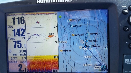 After another 0530hr launch, we enjoyed a pleasant 3hr boat ride dragging rattling “J’s” on CU. and spoons on DR’s. Started marking fish in 90fow so we turned North toward the fleet of bigger boats. One of which was this tanker headed South so we changed our track and headed West to get out of the way. Once back in 90fow we tagged this salmon on a #4 rattling J on 150x30# CU, he was one hungry fish. More arches but no bites so we headed in. Hit our 2nd. fish in 70fow on a Mag. Grn. Dolphin down 45ft. What the Hell is a Sheephead doing that far out? That 12# pound rascal went back in the water. Eleanor didn’t like that bumpy water and neither did my back but I’ll be ready the next time the lake is quiet. Hopefully this heat will end and I can get out in the evening. Martin