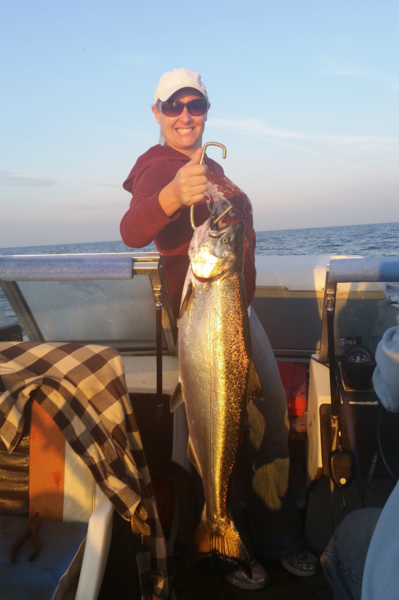 Launched 0500hrs, trolled S/W with a 3 rod spread set by 60fow, one glow J-Plug and one blue glow Ace High on CU. DR with glow Yellow Tail with a Pearl Glow ladder back cheater. 1st hit was a double at 70fow on Ace High and the Yellow tail, lost both fish PLUS That Ace High plug that was pre-rigged on a 40# leader. Lost the steely 20’ from the boat. At 80fow boated a steelie and a laker, then lost another steelie in 85fow on the same Pearl glow spoon. Then it was nothing but grease, even got one on a 3 color in 95fow. Had a monster rip on a Purple Smurf but it didn’t make it to the boat. Back at the dock by 1000hrs. Final tally 4 Laker in the net and 1 released back to the deep, 1 out of 2 steelie in the net.