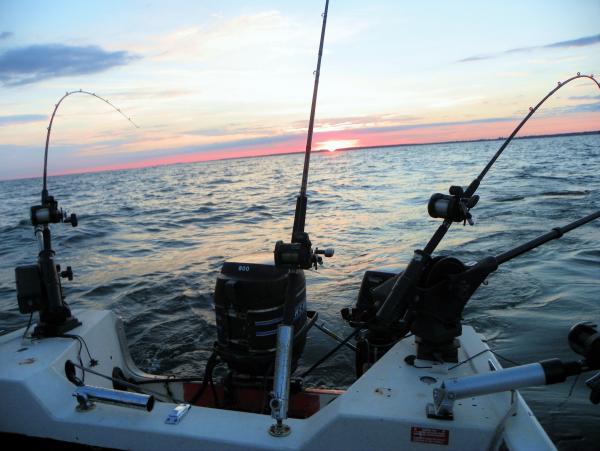 Neil, Corey and I launched at 0515. Just a little bumpy for “Eleanor†so we dropped in at 60fow West of the pierheads With 4 assorted coppers with spoons, 1 DR with spoon and f/slider, 1 DR with B/W Black Death UV. meat rig with an Alewife, I started to layout the sliding wire divers with spoons. A violent strike on the spooned DR was missed by the other guys and I was a little busy adjusting the slide diver, 0-1. An hour later the DR with meat gets slammed but no hook-up, 0-2. Same meat rig fires an hour later, this time a 14# King hits the net, 1-3. Next the 4-color chute rod 400 ft back, w/ an orange jointed Rapala rips. Nice little chrome in the net, 2-4. On the turn for the docks, wire diver with mag green dolphin buckles a little. Another dog-gone Greaser to the net, 3-5. Had another fly-by on the spooned DR, 3-6. Trolled E/W at 2.4-2.5. Caught fish for 65-90fow. 3 fish and 3 misses and we still got Corey back to the docks by 1100hr for his Dr. appointment. Can't think of a better way to watch a sun rise. Martin