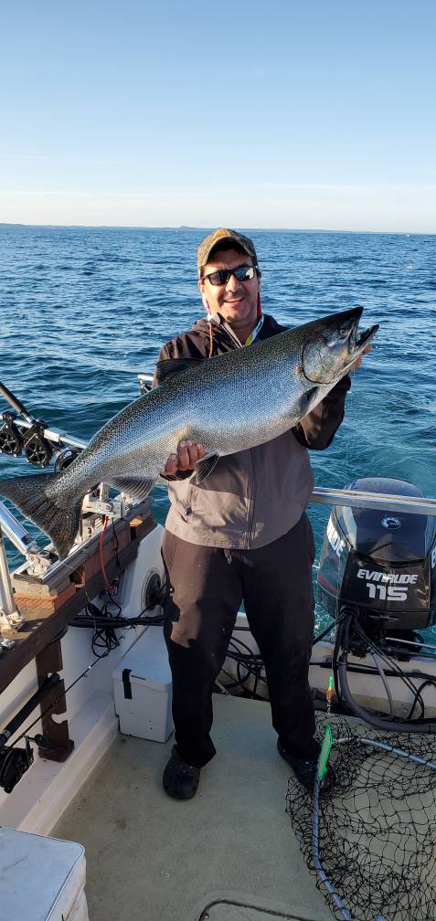 11. What an epic morning Friday was. We started in 100 FOW and worked out to 170. We had some good marks in the 140s and 150s so we slid back inside and that's where we picked up our first two hits. After that, it was all about location, location, location as most of our other hits came in about a 10 acre area. There was a spot I had heard good reports about from the prior day when I got a message from a fellow GLF member who already had 6 kings in the box from that exact location. We decided to not waste and time and headed that way. What was interesting about his location is it seemed like there was a convergence of currents in this one location. Trying to maintain speed here was very difficult. It require constant adjustments to the kicker motor. We got most of our hits on the stable water side of these currents. Other than location, the key to the day was white baits. Meat took 5 of the 11 bites. Spoons took 5 and a paddle and and paddle and fly took the other one. In defense of the paddle and fly, we didn't run many of them. We did have a white spin doctor and mirage fly out for a bit, but after not getting hit we switched it our with another Ghostbuster meat setup. Since there was only two of us, we ran a 6 rod spread. We had one double and one triple and we got all of the fish in the box. This was an aggressive bite. Many fish had both upper and lower jaws hooked as they inhaled the bait. I talked to a few other guys that got a few fish and did well, but this one location was really good for us. The biggest kings were 22.5, 20.5 and 19.5 pounds. The evening was very different. We got out a bit late and started setting lines around 6:30 and fished until 8:50. We trolled through our same honey hole area and didn't pick up any hits so we started looking elsewhere. There were a few other boats in that area and they quickly left as well. We got an 8# king and a laker in 181 FOW. My daughter is pictured with that below. It hit on a 250 copper ghostbuster meat rig. At the dock I talked to a group that just got done with a charter and they described their night as "horrible" with "no fish". So the evening seemed very different from the morning. (If you're viewing this on the GLF app, this table looks horrible so use the image of it below.) The table below is for the AM trip. Time FOW Toll Fish Bait Pole 7:23 AM 162 SW Coho Mag Rosta Goose 100 Cu 7:48 AM 153 SE Miss Blue Flounder Braid SlideDiver, #3 setting out 130 9:43 AM 165 SW King Bloody Nose Braid SlideDiver, #3 setting out 175 9:45 AM 165 SW King Ghostbuster paddle & meat Braid SlideDiver, #3 setting out 160 10:13 AM 176 S Coho Blue Haze paddle & meat 300 Cu 10:50 AM 161 S King Ghostbuster paddle & meat Braid SlideDiver, #3 setting out 160 11:24 AM 161 S King White paddle & fly Rigger down 50 1:06 PM 170 NW King Ghostbuster paddle & meat 250 Cu 1:07 PM 170 NW King Green Jeans 200 Cu 1:09 PM 172 NW King Ghostbuster paddle & meat Braid SlideDiver, #3 setting out 160 3:03 PM 175 E King Green Jeans 200 Cu Does it get any better than this? This guy is 6' 5" tall: 2 Coho and 8 kings: Here's my daughter's king from the evening trip: And finally an image of the table for those using the GLF app: