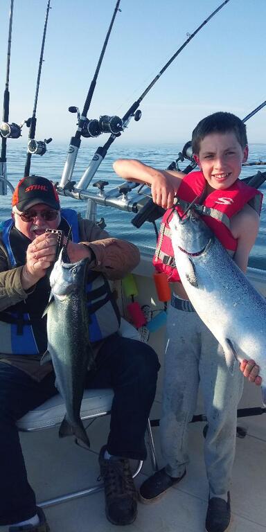 The fish were scattered for us this AM. Not as many marks as last night. Lots more dirty water pumping into the lake from the river. We fished a mile or so north of port. We couldn't find much of a pattern. Meat, mag spoons and flasher flies got hit. Colors included white, green, blues. No hits on orange. Green and blue flounder did not get touched. Baits with dots seemed to be the only common thread. (So blues and greens with dots worked.) 200 Cu and divers were the best rods. Worked 74 to 124 FOW. Fish were scattered in that range. Most hits were 30 - 45 feet down. Water temp was 45 to 46 70 feet down. North troll seemed to work best. 4 lakers, 1 coho, 3 kings. Biggest king was 18 pounds. Fun trip, but we had to work for them. Sent from my LG-Q710AL using Great Lakes Fisherman Mobile App