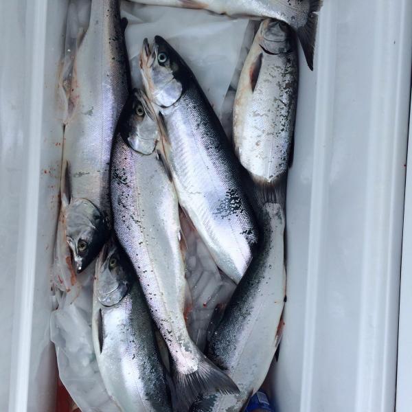 10. Left docks at 6 am. Set up in 70fow on a Nw troll. Went 7 for 12 couldn't keep them buttoned. 3 kings 4 coho. Everything took hits. Rigger down 45 and 60 dipseys with pro troll flasher out 75 and 125. 3,5,7 and 10 with the 10 taking all 3 kings. Yager bomb, bloody nose, mixed veggie, orange crush and blue dolphin