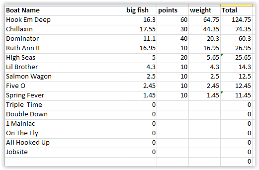 11 boats weighed 6 fish 4 boats did not make 18 lbs for all 6. Take the 16.45 Steelhead out of my box and make me weigh one of the other ones and we would not of even made the payout. Because the rest of the box was all avg fish nice eaters but nothing big.