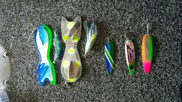 Nice morning on the lake today after having been out of it for a month. Water was like glass with cloudy skies and fog. Ended up 6-6 with two shaker kings, two lake trout, a 4lb king, and a 9lb king. Started the morning hitting a couple in 50-60 FOW, 30-50ft down. Slid out as far as 105 FOW later in the morning with hits at 72, 75, and 84 FOW. Spoons on riggers and spinnies on wire slide divers took the fish. Attached pic is what worked for us. Blue dolphin was hot for most on the radio and heard of one boat that was 11-15 with about half the fish being kings. It seems to be picking up somewhat, not on fire, but getting better.