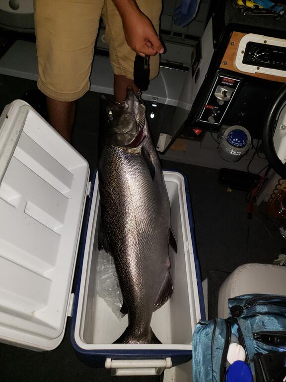 Once again 2md beats me to the punch but all was not lost. Conned my wife and daughter into heading out last night and it didn't disappoint. First pass down the channel, got into a bunch of salad so I turned around and started cleaning lines in Mac. Something heavy on a down rigger. Hand it over to my daughter, she reels in a 17" largemouth bass on a size 4 wonderbread J plug. That's a first. Head back out, get into the lake and a slide diver starts thumping. Hand that to my daughter and the same rigger just explodes. We clear traffic and land a small sheep, throw it back, and then land a 14.3# sheep on the rigger. Fought very hard - thought it was a king. Head in and just past big red a rigger pops and just sits there arced over a bit. As I reach for it a king sharks to the top and tears off across the channel. Somehow there was a gap in traffic as he's now in between the arms on the north side and still going. I crank the boat around and tell my wife to just reel, pull in the planers, point the boat at the fish and goose the throttle. The sheriff comes over to see why this dude just crazy Ivan'ed 135 degrees across the channel. Another boat comes over and passes within 6' of us as I'm motoring, sheriff lights him up and pulls him over. Somehow we get the fish out from under the boat and not tangled and net it. Highlight of the night is trolling back past the sheriff and look over and he's got his phone up filming us. We wave. He points behind us. Seven figure mega Sea Ray just hauling through the no wake zone. Rich boy gets lit up and pulled over. His crew looked happy. Boat name "Running Late". ha ha ha ha Last trip down the channel slide diver gets popped and I gun the throttle trying to pull the fish out of traffic and into Mac. He ain't having it and jumps. Lead boat in the pack behind us slows down and the other 4-5 do as well to allow us room to play this thing out. Can't say thanks enough. Land it by Van Andel's docks and hoist it up to applause from the boats around us. -