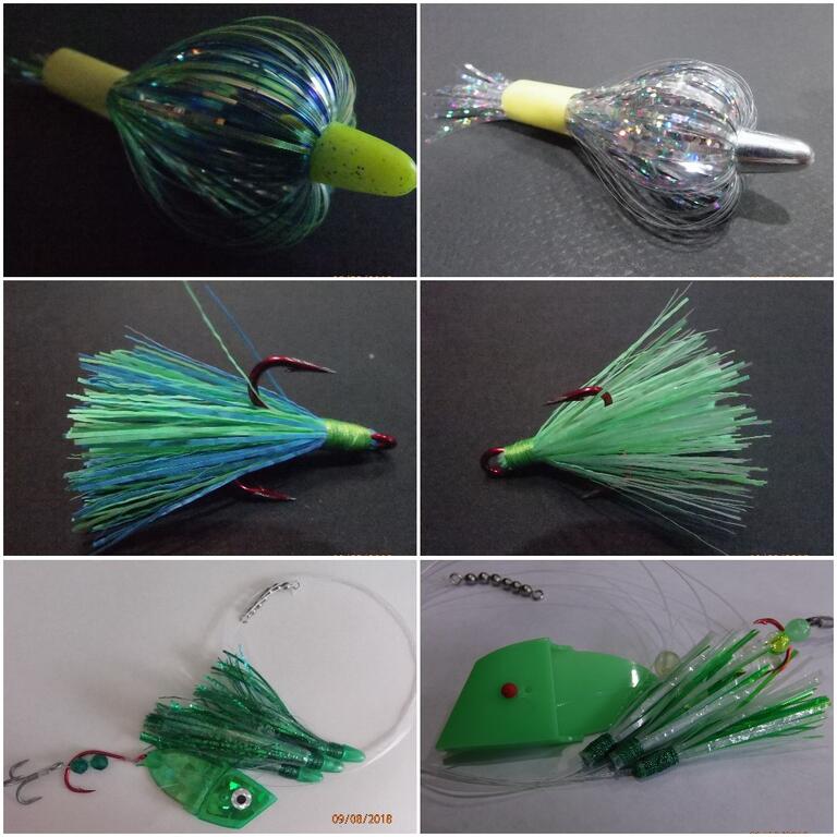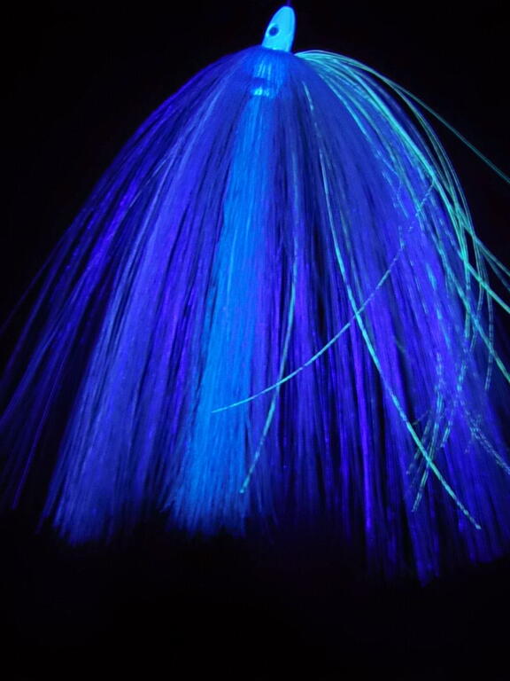 I have 8 different flies that I am selling. Pictures show flies in regular light and under a UV light. All are in multiples of your choosing. $4.95 per fly. All flies come with tournament tied rigs that have 36 inches of 50# Seaguar fluorocarbon, a #1 VMC 4X treble hook, a 4/0 Gamakatsu single hook and a rattle. I can make other colors upon request. I'll except PayPal and buyer pays shipping (usually $3.50)