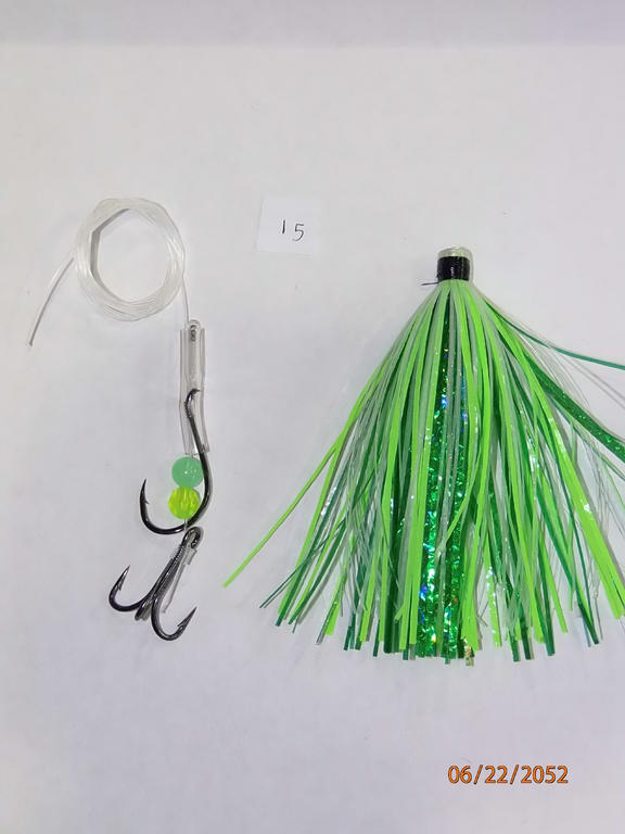 Tournament rigs are ties with 50# Seaguar fluorocarbon, #1 VMC treble hooks, 4/0 Gamakatsu single hooks and rattles.