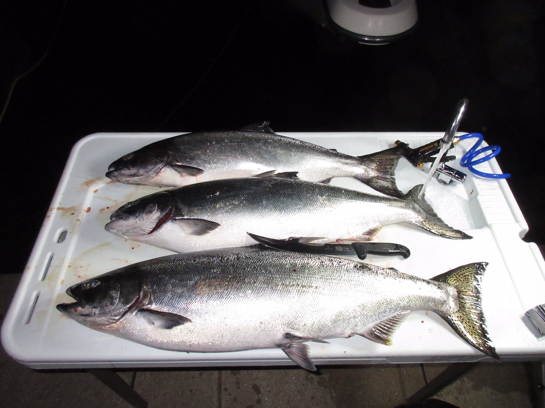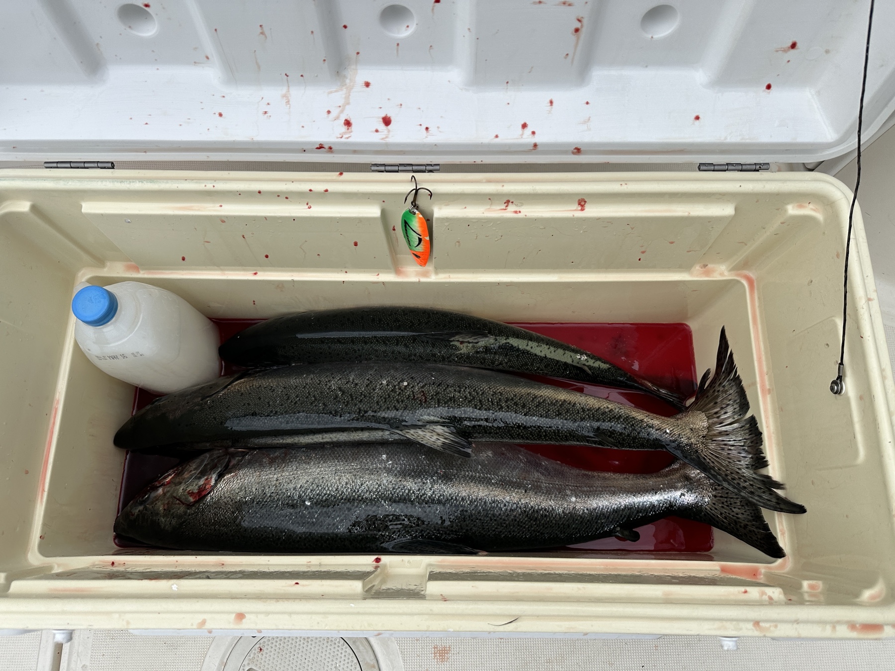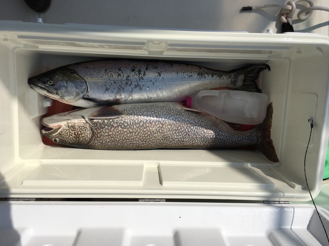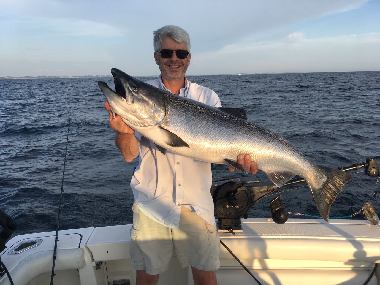Fished Sunday evening from 6:30 to sunset. Went 7 for 9. Largest were 21 & 22 pounds. Consistent action the whole trip. Headed south in 70 to 85 then came back north. All spoons with blue and green was the ticket. Rigger down 55, slide diver back 100, 10 color, 150 cu. surface was 50 degrees, 47-48 down 60. The cooler was full! Sent from my iPad using Great Lakes Fisherman Mobile App