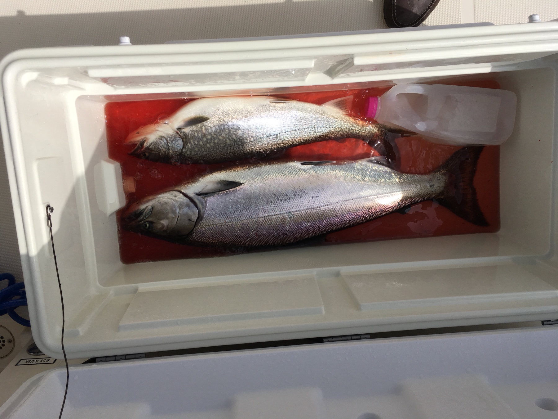 Fished from 6:15 to 11:30. Caught a 10# king on a blue/white spin doctor and green/white fly down 50 in 124 FOW on a SE troll and a lake trout on a silver/green spots spin doctor and a blue/silver with yellow spots whirlygig on the bottom in 125 FOW on a NW troll. Both came straight out from GH. The fog rolled in about 7:15 and stuck around most of the morning! Water was 62 on the surface and 45 down 60 feet! Sent from my iPad using Great Lakes Fisherman Mobile App