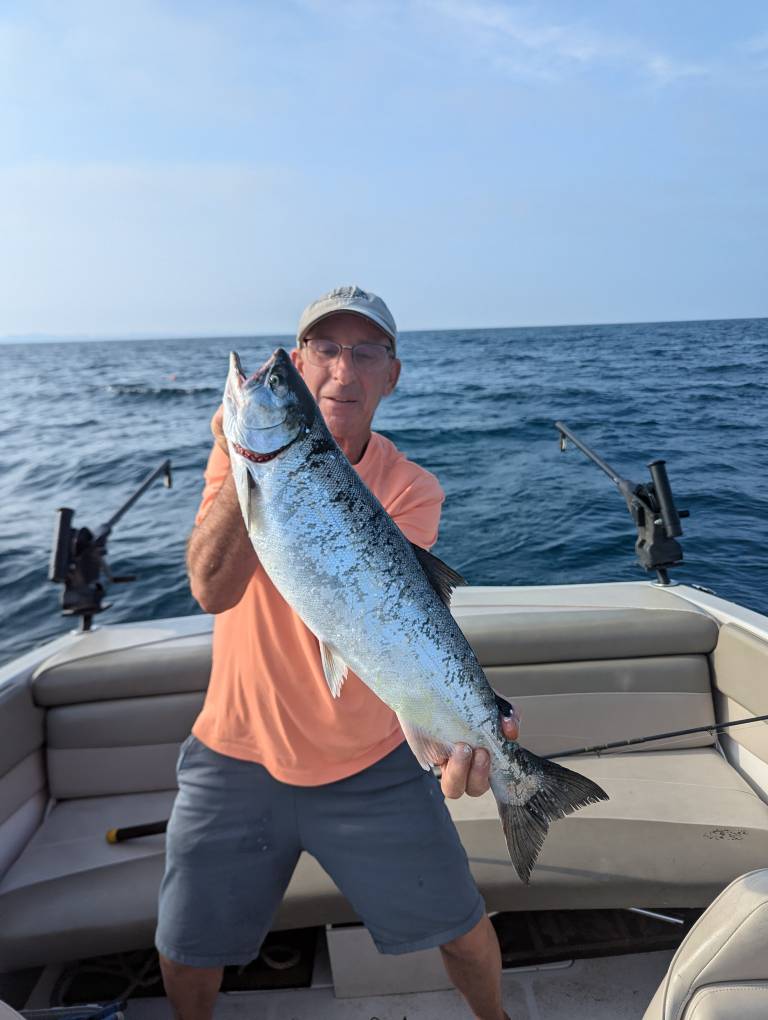 We trolled from 6 to about 9 am. NOAA said waves a foot or less, they were easily 2+ feet out there. We went 2 for 4 with a 15# king and a 3# coho. As soon as we set lines at 78 feet we got a double header and landed one that was the king, followed by a miss about ten minutes later at the same depth. After venturing out to 120 following a dry spell and not seeing much interesting we came back in and as we were pulling lines in to call it a day we got the coho in, you guessed it, 78 feet. Here's what took the hits: 2-3 pro troll 8" custom uv perch flasher with a rapture illusion uv fly on a downrigger 65 ft down 0-1 moonshine magnum flounder pounder 50 ft down on a downrigger Sent from my Pixel 6 Pro using Great Lakes Fisherman Mobile App