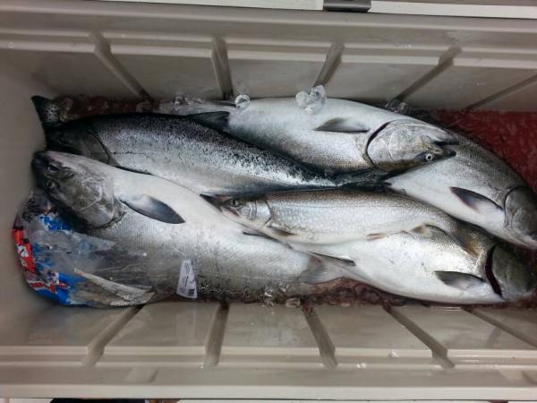 Had a double today. Fished the mud in the morning for four hours and went 8-10 with some quality fish. Meat and flies worked best 70 back on divers and 40 down on riggers.