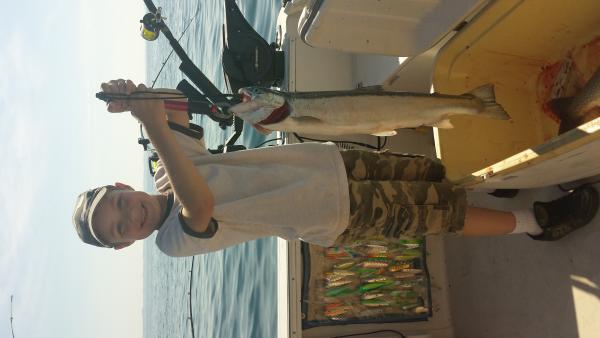 Reel-Deal Posted July 25, 2015 Posted July 25, 2015 Took out a friend and his 2 boys for their first time fishing. Things picked up a bit from our trip 2 days earlier. Fished from 8 am - 2 pm and went 4/5 Fished a nice temp break straight out of harbor to about 2 miles north between 100-140 FOW 14# laker - 107 DR over 135 FOW - with white SD and lil' boy blue Howie fly 7# coho - 6# steelhead - 150' copper with orange crush 1 shaker king on 200' copper and blue dolphin mag spoon (was hoping to release him - but we dragged him around for a while and his face was really tore up) 1 - big rip on braided mag dipsey with blue dolphin fish catcher and blue chrome clean meat rig. The boys were thrilled - I love seeing newbies catch fish! Beautiful day on the water this past week!