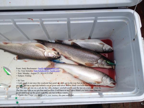 No guarantees Posted August 5, 2015 Posted August 5, 2015 I'm toms buddy from marquette mi. We have had great luck the past two years with gl-tackle squids and flies behind dodgers and cowbells 18 to 24 inchs behind cowbells at 1.5 to 1.7 mph. We have been running within a foot of the bottom and three feet from the ball.