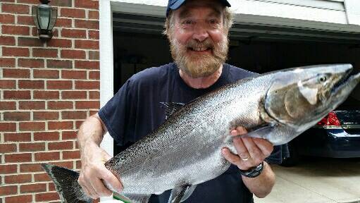 1 for 1, 15.15# king, 110 fow, 75 down on DR, green dotted sd, with uv green meat rig, 100ft back, se troll, 2.5 sog, 47.5 at ball. No hits on plugs,spoons,or flies.