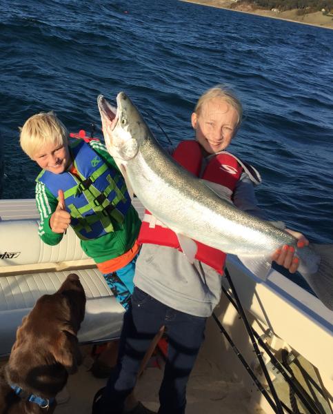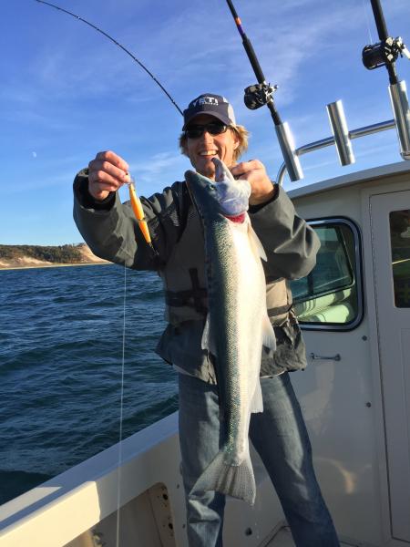 2MD Posted October 23, 2015 Posted October 23, 2015 The older kids and I decided to venture out and fish since the lake had finally calmed down a little. It was not calm by any means but it was fishable. We had hard 4 to 5 footers out of the north crashing into us so we ran north into them and swung around and setup in 45 FOW off tunnel park and trolled south. Ended fishing for only about 50 minutes. Ran two high-lines with orange body baits. Ran 2 half core. Ran 2 full core. Ran 2 dipseys. 1 for 1 High-line orange board with jointed Rapala orange body bait. Our biggest steelhead of the season. Jumped at least 14 times and ran out the counter to 460 feet. The thing never really tired out on us and was even jumping behind the boat as we went to net it 20 minutes after hooking up. Beautiful fish. We did not weigh it because we could tell it wasn't master angler. It wasn't but a few years ago we managed a couple 12-15 pound steelies on this same setup but this year they just weren't as big. The head on the thing was monstrous but it looked kind of starved and anorexic. Fun time and felt good to be back out there. Wish it wouldn't have been so rough!