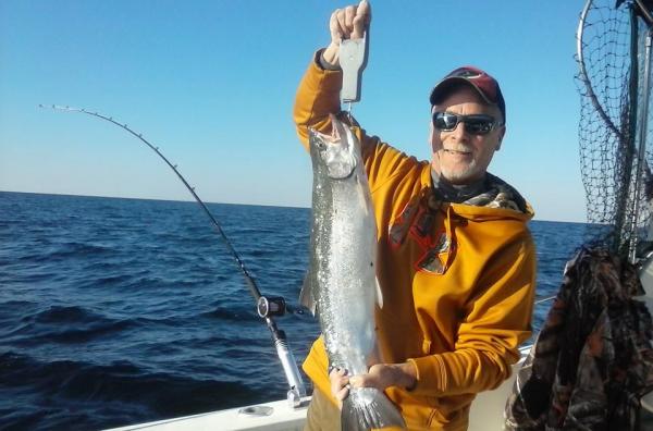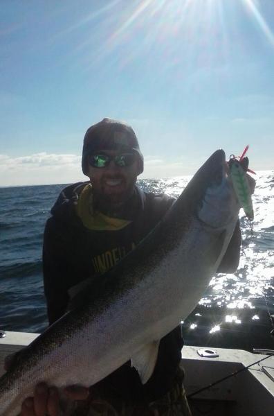 tbutcher Posted November 9, 2015 Posted November 9, 2015 Started out frosty about 8:30am had to scrape the windshield of the grady white. dopped lines in 90fow spotted some birds and headed nw toward them to 120'fow. All hits were in about 120fow. Waves about 1' and slowly built to 2'-3' by 1pm. . First spoon Craigs flounder ironically uncle Craig's first fish of the day on rigger nice 10lb steelhead in 120fow . Then doctored moonshine(green jeans) took over had the next seven hits on copper lines landing two. Then on our way back in doctored moonshine took last fish while bringing in downrigger. we ended up 4for9 at 1pm. Couldn't ask for a better day. I was fortunate to get out and have such nice weather and spend some quality time with uncle craig.