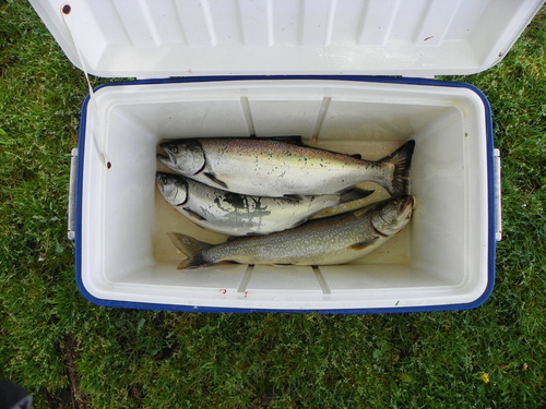 Martin1950 Posted May 12, 2016 Posted May 12, 2016 Last late start for Neil and me! Cleared river at 0800hrs. Sat down in 60 fow and started a six rod spread. Boxed a Laker in 65fow on a mag diver at 1 ½ out 125’, DW Green Dolphin at 0815hrs. Lost a fish on 250x30 w/ Mix Veggie in 80fow. Trolled out to 90 and back to 65. On the turn back out we boxed a King on the 250x30 CU w/ Mixed Veggie. Back out in 85fow lost another fish on the same 250x30. Turned around at 120, pulled a DR and layed out a shute mono line w/ a Fire Tiger crank bait back “409”and boxed a Ho at 100fow. Not another hit on the way back to 65fow and pulled lines. Lesson Learned; always carry enough fuel to get out to 200fow and back because that was the flattest water I have seen this year. Martin 3