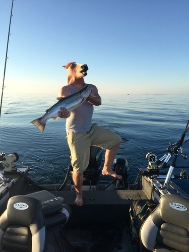 Hit the water at 6:00 PM. Ran straight out to 95 and set course south as we set lines. Maneuvered to a SE troll and picked up a 19.9 lb King on a dipsy out to 120 on a meat rig. Ran out to 135 and picked up a decent Steelhead on the same dipsy. Ran back in to 120 and picked up another nice King on 300 long line, as we were bringing it in, the other long line hit. Probably the most powerful fish I have fought. Never seen it. Snapped the line about 3 minutes into the fight. Wish I had that one back.