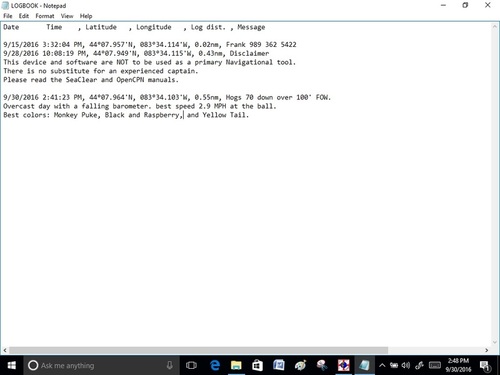 Priority1 Posted September 30, 2016 Posted September 30, 2016 I use my toughbook chartplotter for information I want to save. The SeaClear program has a built in logbook. If you put in a note it's complete with a coordinate and date automatically. At the dock or in the house you can later add all the details you want. Here's a screen shot. Click on pic to view.