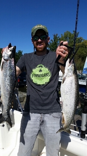littleboat Posted September 20, 2016 Posted September 20, 2016 Holland am, 9-20-16 Fished 7:30-11:30, in 90-125 fow, 2/4, one coho and one laketrout. Both on same DR with different spoons. Lots of marks in 110-125 zone. Waves started as 3 ft rollers, but eventually layed down. 1st DR hit, one laker on uv blue dolphin, bk 40, south troll, in 110ft, 100ft down, ball temp 46.3, speed 2.7. 2nd DR hit, one coho on blue flounder pounder, bk 35, south troll 2.8, temp 46.8, down 78, in 122 fow. Two other lost on 270 cu with jager bomb. Spit the hook. Tim joined me today. 5
