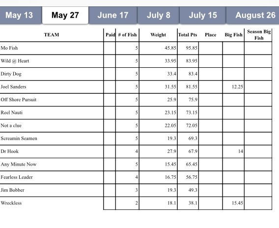DIRTY DOG Posted May 31, 2017 Posted May 31, 2017 WMFL May 27 results Sorry for the late update on last Saturday's scores and season totals but here they are. I would also like to congratulate team Wreckless on winning big fish for the day , he fished the smallest boat we have ever had in the league , and did it completely solo, great job sir!
