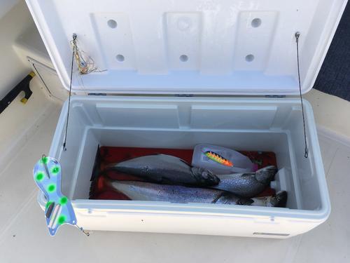 Fished from 7:30 to 11:30 and went 4 for 6. Headed straight out and set up in 100 fow and trolled NW out to 220 and headed back SW. All the fish came in 190 to 220 fow. 5 of the 6 came on a 10 color with a yellow/green/orange spoon (can't keep track of all the wild names!). A 8# king came on a spin doctor (silver w/ green spots) and a orange/red fly on a rigger 81 down in 190 fow. Also got a 5# Coho and a couple small greasers. See attached pic that shows the lures! It was a beautiful morning on the big lake!IMG_2963.jpg