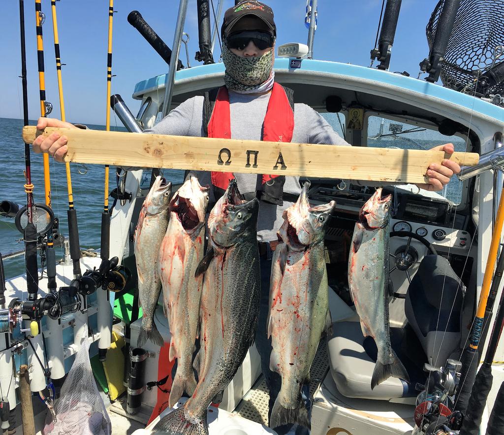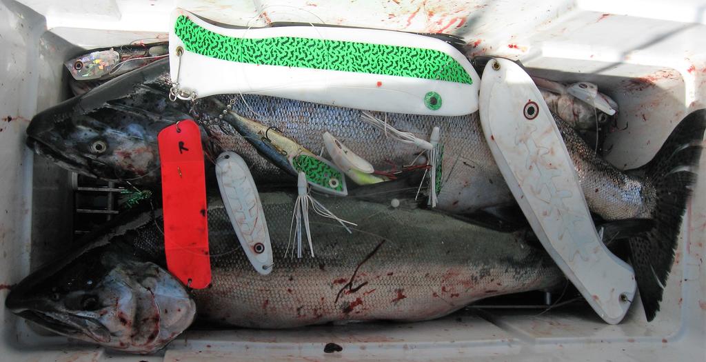 The Greek Posted August 6, 2017 Posted August 6, 2017 Manistee Aug 1 to Aug 3 After a year of waiting, it was finally time for my trip to the famous Manistee area to chase the “monster of Manistee”; the huge Chinooks that stage in the area this time of year. With high hopes, my son Nik and I made the 9-hr. drive from Springfield, IL to give it a go for a few days. I predominantly fish the West side of the lake near the WI border. While we do well on very large Coho, Lakers, Steelhead, and Browns, I don’t get many Chinooks testing my gear like they would on the East side (even though I try for them aggressively every time I go out). The goal was to fish the late afternoon/night bite every day, but the wind/waves/weather dictated otherwise. Here’s how it went:August 1: Wind: SW wind 10 kn in the morning, changing to NW by 1100.Water Temp: 68 deg F at 0500 at the surface when we dropped lines at 100 ft. depth. FishHawk read 42 deg F at 50 ft. depth, and the magical 50 deg F was found at 40 ft. down so we worked that depth.Program (with two aboard): Two riggers. Two slide divers. One Cu and Pb off 2 big double planers (Cu: 200, 300, 100+30 ft Pb, and 50 Cu).Best speed: 2.1 to 2.7 mph SOGBest lures [All Captn John King Lexan spoons and meat rigs]: 1. “XG Ghostbuster” (3.75”) off D-rigger was the stud for the day taking one smaller Chinook (10#) and one nice Coho. Depth was 100 ft back and 40 ft down. Was hit hard 2 more times, but the hits didn’t stick. 2. “XG Ghostbuster” (11”) meat rig with three twinkies and a matching meat head. Set at 50 ft down and 50 feet back. Deployed off the D-rigger, this set up accounted for one 13 lb Chinook. 3. “XG Frog” (11”) meat rig with three twinkies and a matching meat head. Set at 30 ft down and 70 feet back. Deployed off the D-rigger, this set up accounted for one small Lake Trout. 4. Clean magnum meat head with silver ice tape head with no flashers or twinkies deployed off slide diver (120 ft back on a #3 setting). This rig accounted for one 12# Laker. Best fishing location: 150 to 300 ft depth S of the Port. Best direction: S to N Best Depth: 40’. Notes: All fish had no clipped fines. In hindsight, I probably would have had better success if I had not deployed the meat rigs and spoons together. However, Captn King’s Lexan spoons have such great action at all speeds that I don’t worry about it. I need to do a better job of using the right gear for the right speed. My Lowrance Autopilot has a great function called “zigzag” which does what it says: it zigzags the boat side to side which activates the lures differently on either side. This allows me to use meat rigs and spoons at the same time more effectively. August 2: Wind: SW wind at 12 kn early, then changing to NW and building to 25 kn by 1100. This brought on eight ft swells at two seconds apart. A very dangerous situation.Water Temp: 67 deg F at 0500 when we dropped lines at 70 ft depth. FishHawk read 42 deg F at 25 depth and the magical 50 deg F was found at 15 ft down. We saw a plethora of bait in the harbor, and outside the harbor the entire time we were fishing. Fish arch symbols were very thick, but very shallow from 25 to 35 feet deep. Program (with two aboard): Two riggers. Two slide divers. One Cu and Pb off 2 big double planers (Cu: 200, 300, 100+30 ft Pb, and 50 Cu).Best speed: 2.1 to 2.7 mph SOGBest lures [All Captn John King rigs]: 1. “XG Ghostbuster” (4.65”) off of the slide diver and wire set at #3 setting 75 feet back and estimated at 30 feet down. A hard hit and a short battle resulted in one nice 10# Chinook. 2. “Mountain Dew Glo” spoon (3.75). Set at 40 ft down and 60 feet back on d-rigger. This spoon also had a vicious hit that stripped 300 ft of line off the counter reel. After a brief battle, the mono leader broke and the fish was gone. This same set up had one more hard strike that came unbuttoned approx. 10 seconds later. 3. “Smurf SUV” spoon (3.75”) set on braid slide diver set on #6 setting and 120 ft on the counter. Got a solid strike and approximately 200 feet of line peeled off when the fish suddenly got off from a broken leader. Very hard to take that kind of loss. Best fishing location: 30 to 50 ft depth N and S of the Port in the milky water right next to the dirty brown river plume getting blown around by the NW wind. Best direction: N to S Best Depth: 30’. Notes: I screwed this day up pretty good by ignoring the shallow fish symbols all over the sonar and fishing too deep and below the fish with meat. Thanks to Captn John for the mid-morning phone call slapping me to my senses and telling me to run an all spoon program and chase those shallow fish. The wind caught us by surprise 5 miles from shore. We fought eight foot swells all the way back to the harbor. Thanks to Agios (St.) Nikolaos for bringing us back safely and thanks to my C Dory OPA for running the waves effectively. August 3 (morning foray): Wind: NW wind at 12 kn early, then settling down to a consistent 10 kn coming out of the NE. The swells had settled down from the previous days madness, but the conditions were still pretty tough on Nik, my trusted first mate.Water Temp: 67 deg F at 0630 when we dropped lines as we came out of the harbor and headed N in 40 ft of water. FishHawk read 45 deg F at 25 depth and the magical 50 deg F was found at 15 ft down. The water temp varied wildly on an ongoing basis and we did our best to stay on temp. Program (with two aboard): Two riggers. Two slide divers. Two dipsy divers.Best speed: 2.5 to 2.8 mph SOGBest lures: We stayed with an all spoon program trying to make up for my screw up yesterday, and to cover more water with the higher speeds [All Captn John King Lexan spoons]: 1. “XG Ghostbuster” (4.65”) off of the slide diver and braid set at #3 setting 90 feet back and estimated at 30 feet down. No fish caught, however, a solid fish hit and stripped 400 ft of line in seconds as shown on the counter. Aft