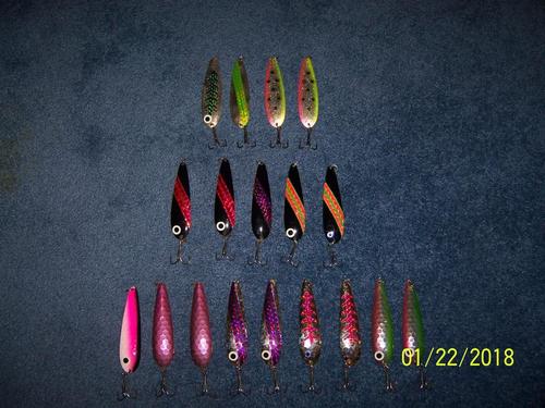 Persistence Posted January 24, 2018 Posted January 24, 2018 I have 1 set of Pirate #66 and 2 sets of NK Mag Spoons for sale Row 1 set of 4 Pirate #66 Spoons-Silver Cups Asking $20.00US Shipping Included Row 2 set of 5 Northern King Mag Spoons- White Cups Asking $25.00US Shipping Included Row 3 set of 9 Northern King Mag Spoons- Purple Back and Strawberry Ladder Back have Gold Cups all others have Silver Cups Asking $35.00US Shipping Included Buy 1 set for price shown or by all 3 sets for $65.00US Shipping Included. All Spoons are new and have not seen the water. Split the sets with a buddy!!!!! Please contact by Post or PM Thanks