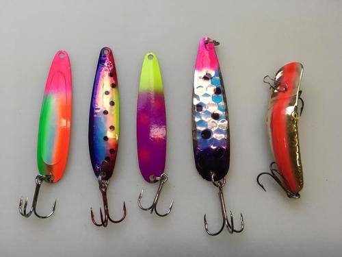 Sea Eagle Posted June 10, 2018 Posted June 10, 2018 Hit the Ohio waters of Lake Erie Erie on Friday 6/8 with my two brothers-in-laws. We ended up 19-21 on the walleye (tossed one U/S fish back) 6 sheepshead, 3-4 white bass and a really nice catfish. It was most definitely a spoon bite. Bigger baits like the hot bandits and thunder sticks we have used on other trips did not get bit. Ran the same rod and reels and some of the same lures we used for spring Coho fishing in southern Lake Michigan this year with a spread of 2 & 3 color leadcore and 3.5 Mag Lips on mono as our deepest lines running down to 20'. Copper backed UV Jager Bomb walleye size spoon was hottest, standard size UV Whammy salmon spoon took its share, blueberry muffin colored walleye spoons took a couple and a gold/orange/white belly mag Lip was also hot. Made 2 1/2 downwind passes running SW from the NW corner of Kelly's Island down towards the NW corner of Catawba Island. Picked up and motored back to Kelly's island after each of our runs. Speed was 2-2.5 mph on the GPS, occasionally pushing 2.75. Here are the hot lures. The UV spoons have copper backs and the blueberry muffin spoon has a chartreuse back.
