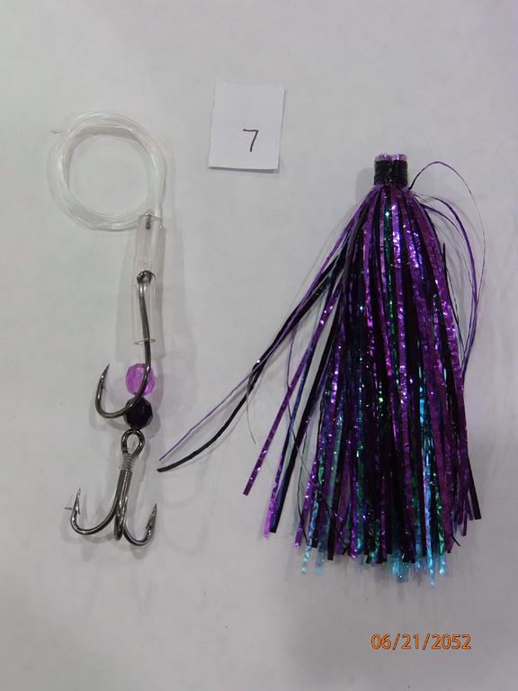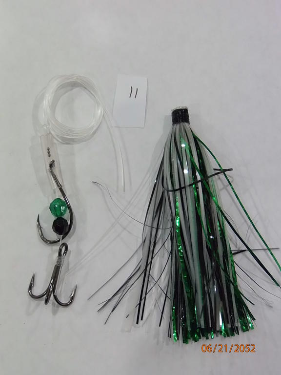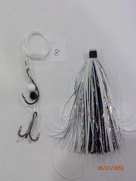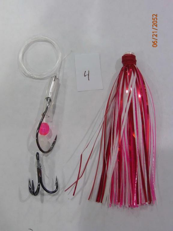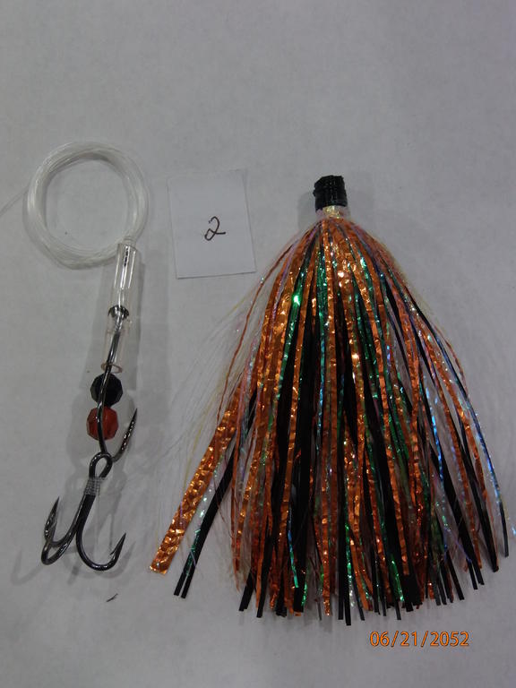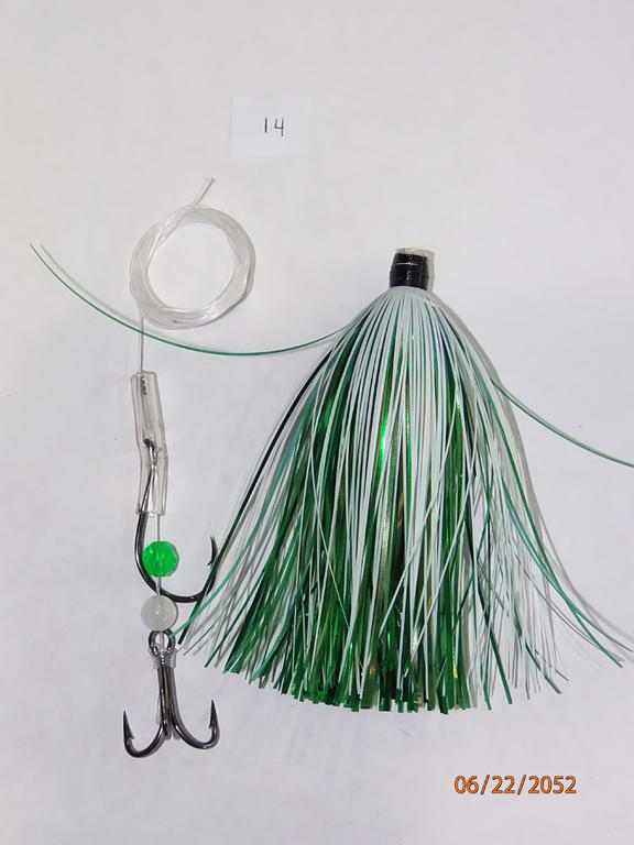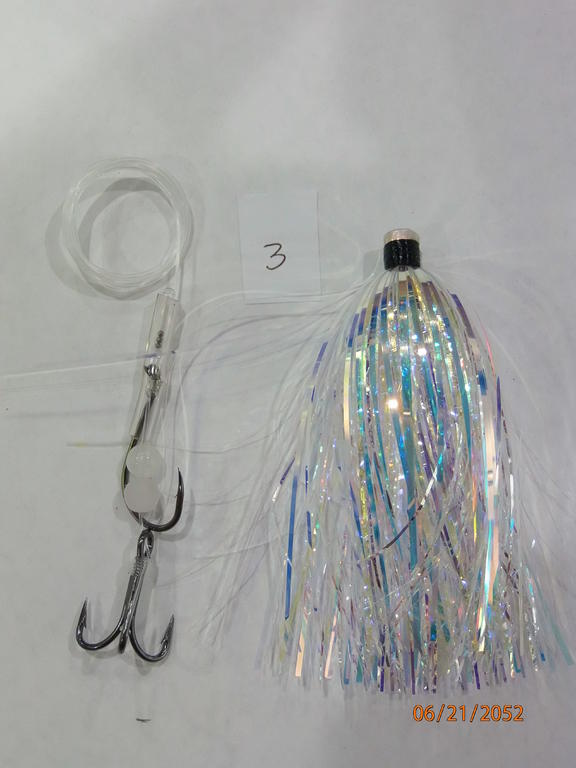 Wherearethey Posted June 19, 2018 Posted June 19, 2018 Trolling flies with tournament tied rigs $4.50 (4" flies) and $5.50 (6" flies) each plus shipping Tournament rigs are ties with 50# Seaguar fluorocarbon, #1 VMC treble hooks, 4/0 Gamakatsu single hooks and rattles. All pictures show 4" flies made with bullet heads. Picture of 6" magnum flies available upon request. Twinkie flies and flies for Spin-n-Glows available as well. I will make multiple flies (rigged or unrigged) and rigs. Please PM me with any questions/requests. I will except PayPal F/F. Thanks. C