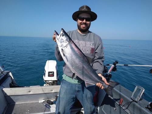 jdh Posted May 6, 2019 Posted May 6, 2019 Due to the slow action in South Haven on Saturday, I decided to run south Sunday. Thank you Joe for joining me! Aftermaking it out of the pier heads around 7 am we set up in 45 fow outside of almost all the boats. We worked our way in and out to 70 fow with nothing and then shifted to a NNW troll to get to deeper water. Once we got 80 around 8 am, the dipsy fires and we got our first king of the morning. About an hour later the 100 copper fires and the slide diver fires. 2 steelhead, got the small one, but the bigger one got away. At 10 am we decided to make a change, so we pulled lines and ran about 6 more miles to the west setting up in 95 fow. First fish hit in 105 and then we had a ton of bites in 105-120 fow making big circles for most of the rest of our time out there. At first it was all kings with 2 about 18 lbs and 1 about 20. Then the lake trout started eating. We ended the day 16-18? Not sure because we let a bunch of lake trout go next to the boat. 6 kings, 1 steelhead and the rest lake trout. Everything from 40-110 feet down got bit. Most of the kings came on riggers down 60-70 feet with stinger uv spoons with yellow colors. Yellow tuxedo was hottest. Lake was glass calm. One smaller lake trout was stuffed with alewives. 8