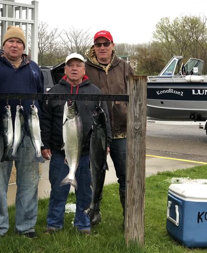Guaranteeit Posted May 13, 2019 Posted May 13, 2019 Fished Saturday morning. 4/5 in 70-90 ft water. 1 19.5lb King, 2 12lb Kings and 1 Laker. Lost the 5th a King at the back of the boat. Carmel dolphin, meat, and a orange/blue/green spoon took the hits. 30-40 feet down was the depth. Speed 2.5-2.7 at the ball 2