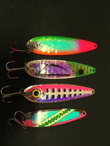 Sea Eagle Posted May 15, 2019 Posted May 15, 2019 Went 12-15 in St. Joe today. 9 kings including one 22 lb and two 20 lb fish, two Coho including a nice 10 lb fish and one laker. Best depth was 95' to 115' mostly NW of pier. Everything took fish. 5 color, 10 color, 200' and 300' of Copper and down riggers set anywhere between 55' to 75' down. Hot lures were Moonshine RV Flounder Pounder, Moonshine RV Craig's Flounder, Green Dolphin, Jager Bomb and a couple of UV lures doctored up with a pink paint stick as shown in the photo. Green and something with pink on it were the best colors. I don't have photos of the spoons my buddy was running, but here are mine. 5